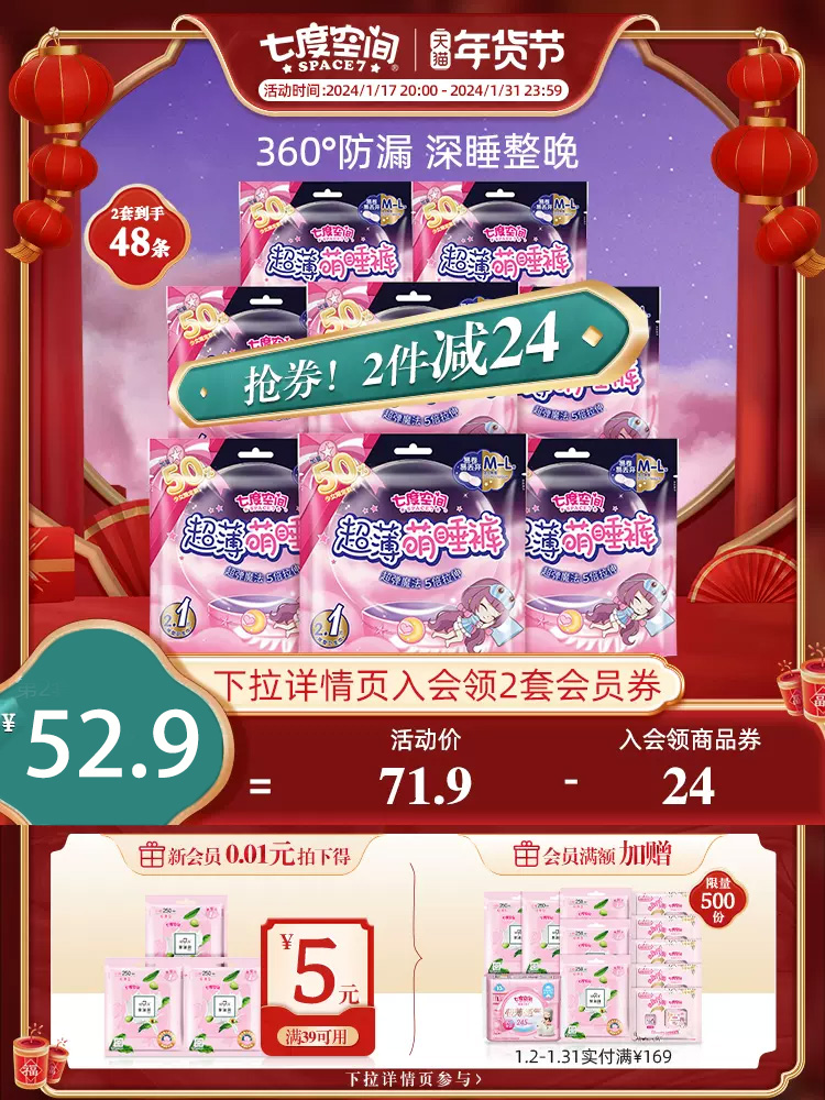 【凑200-30后到手42.11】量多的夜晚很困扰,七度空间安睡裤解除烦恼~500mm超长巾身,360度防侧漏,高弹性,舒适不紧绷,大小码可选,挤压不变形,胖瘦都能穿,让你安睡一整晚